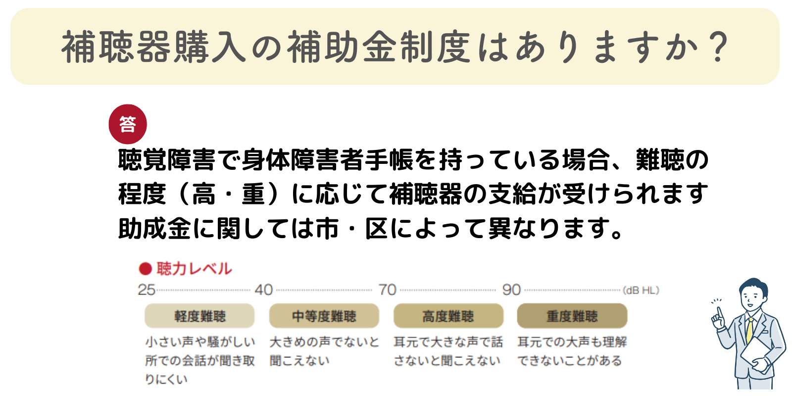 難聴が高度・重度で身体障害者の基準に適合する場合は、障害者総合支援法による補装具費支給制度を利用することができます。