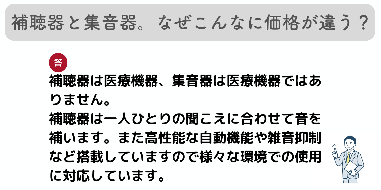 補聴器は聴力に応じて不足している音を補います。集音器は音を一律に大きくするため一人ひとりの症状に合わせた調整が困難となります。