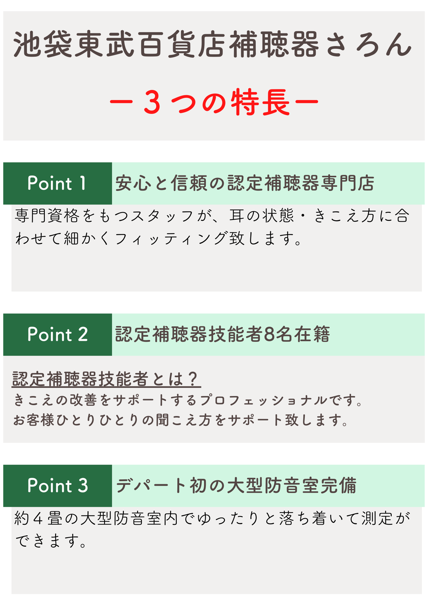 東武百貨店池袋店 5F 10番地にある「認定補聴器専門店」です。補聴器のスペシャリスト「認定補聴器技能者」が長年の実績と豊富な知識で、補聴器を初めて装用する方、うまく使えていない方などのご相談からアフターケアまでサポートいたします。
